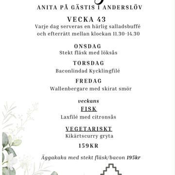 Vi serverar dagens rätt med salladsbuffé, måltidsdryck, smör bröd och dessert.